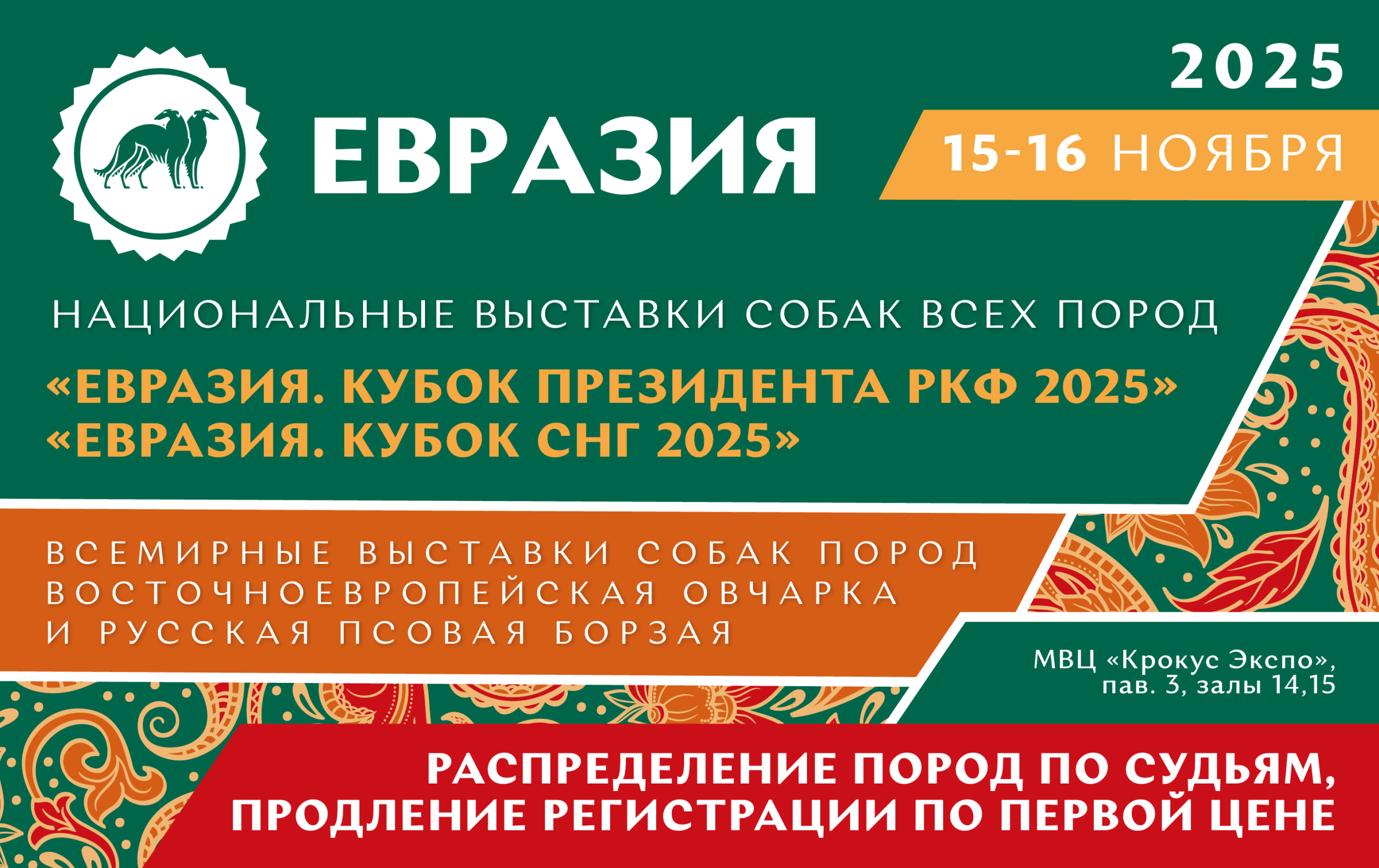 Опубликовано распределение пород по судьям на выставках «Евразия. Кубок Президента РКФ» и «Евразия. Кубок СНГ», регистрация по первой цене продлена до 30 сентября включительно.
